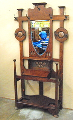 Antique walnut hall tree with shoe box, key drawer and umbrella boxes.