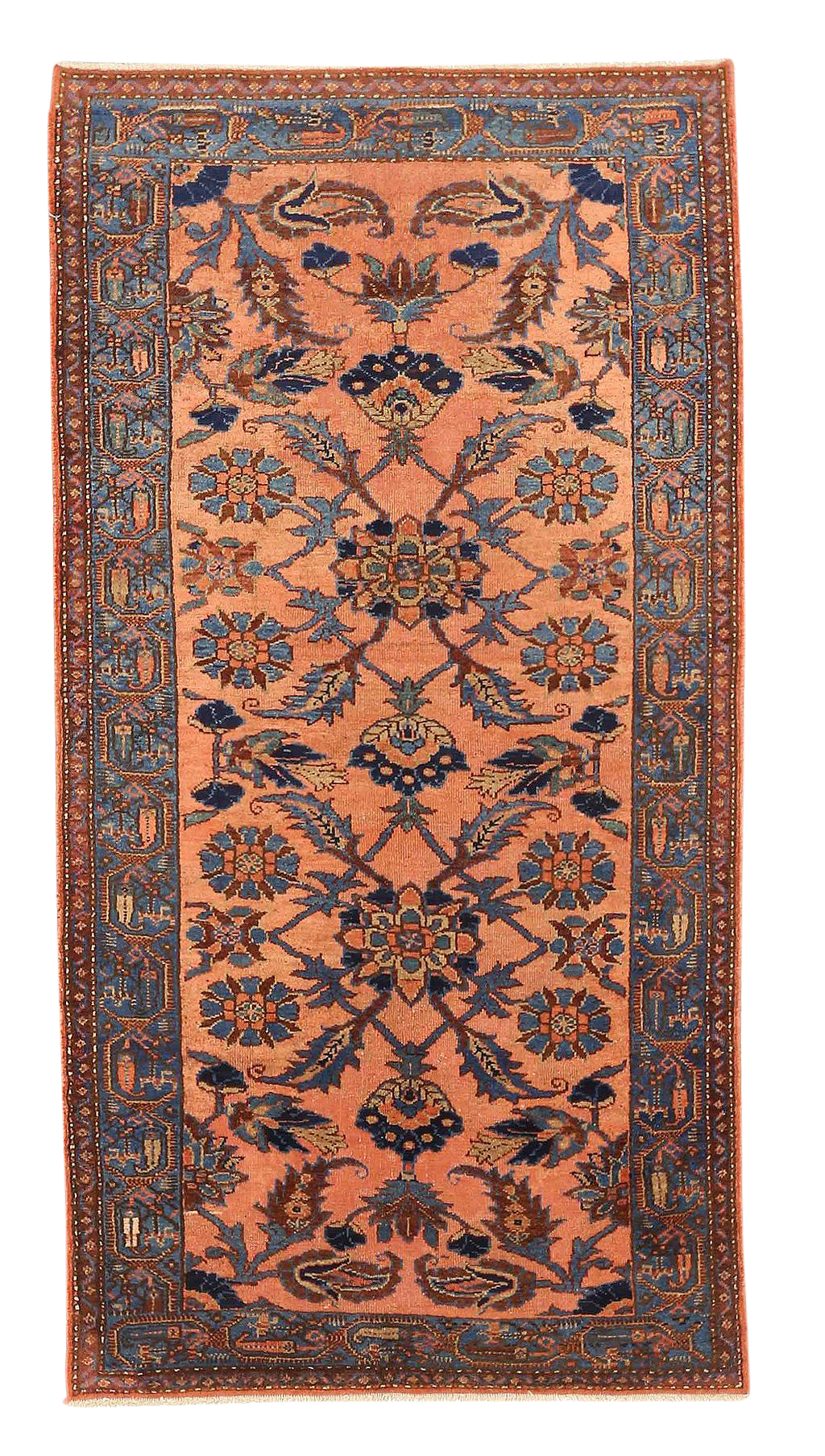 Shades of ocean blue shine through this multicolored rug.
